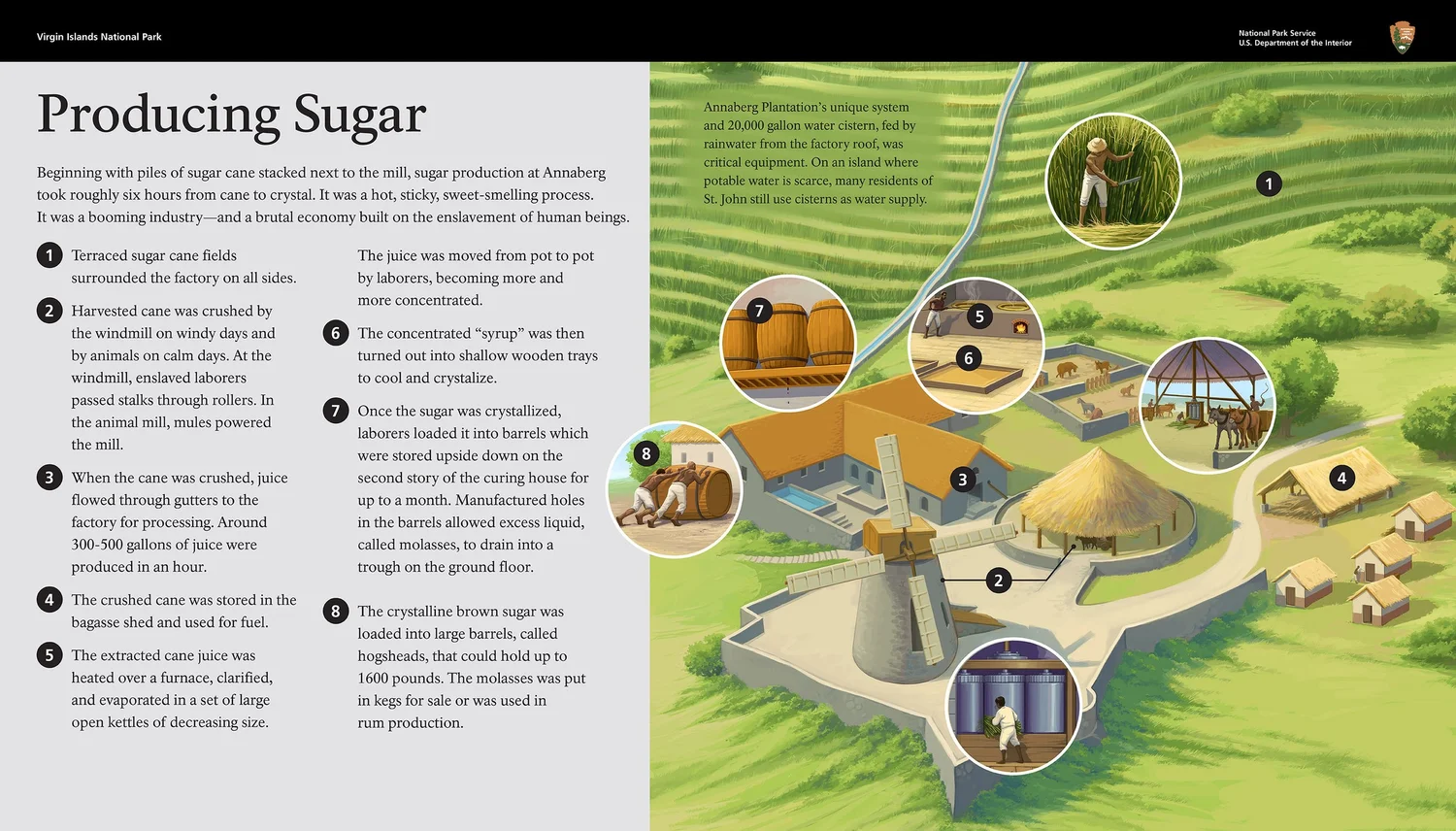 The ruins of Annaberg Sugar Plantation in Virgin Islands National Park is one of the finest remaining example of Danish Colonial Era industrial agriculture in the eastern Caribbean. Today, the Annaberg Plantation reminds us of the daily lives of an enslaved people and traces their resistance to slavery. Design and layout by Sea Reach Ltd.